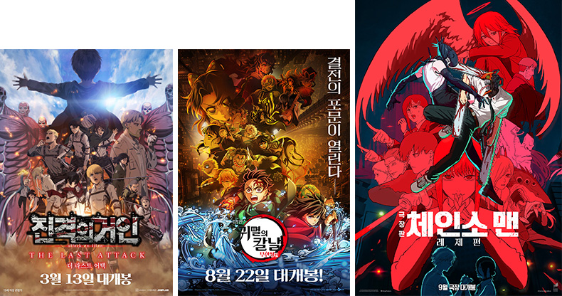 ▲ <극장판 진격의 거인 완결편 더 라스트 어택>, <극장판 귀멸의 칼날: 무한성편>, <극장판 체인소 맨: 레제편>